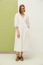 Платье женское полуприлегающего силуэта. По горловине v-вырез с планкой. Спинка со средним швом и застежкой на потайную молнию. По низу платья односторонние складки.