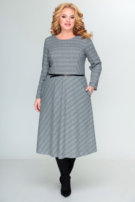 Платье женское полуприлегающего силуэта. Выполнено из трикотажного полотна. Платье отрезное по линии талии. По лифу переда расположены рельефы, по лифу спинки – талиевые вытачки. Нижняя часть платья А-силуэта. Спинка лифа платья со средним швом, в который вставлена потайная молния. Юбка платья переда и спинки цельнокроеные, выполнены по косой. В боковых швах юбки расположены карманы. Рукав втачной одношовный, длинный. В комплект входит ремень.