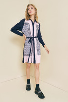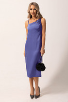 Платье выполнено из плательного струящегося сатина.  Лиф отрезной по линии талии. Линия талии регулируется резинкой. Нижняя часть платья А-силуэта.  Рукав длинный втачной. По низу рукава сборка и притачная манжета, застёгивающаяся на 2 петли и пуговицы. Горловина округлой формы, по центру переда капелька с завязкой. В комплекте ремень.