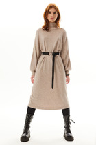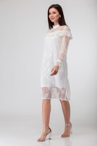 Платье полуприлегающего силуэта, без рукава. Горловина платья круглая. По переду платья расположены нагрудные вытачки. Спинка с талиевыми вытачками и средним швом, в который вставлена потайная молния. По низу спинки обработана шлица.