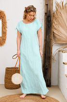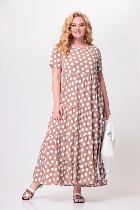 Платье полуприлегающего силуэта, длиной maxi. Выполнено из вискозной ткани. Платье с отрезной, слегка завышенной линией талии. По переду лифа расположены нагрудные вытачки. Рукав втачной короткий. Горловина округлой формы. По низу платья - 4 волана, собранные на сборку. В боковых швах платья расположены карманы.