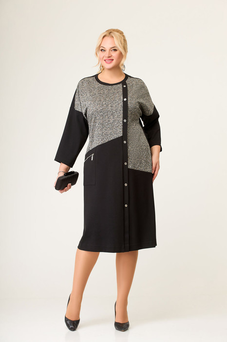 Платье прямого силуэта, выполненное из комбинирования двух видов трикотажных полотен. Платье - со спущенной линией плеча и длинным одношовным рукавом. Горловина платья круглая. Перед - с косыми подрезами и, смещённой от линии центра, притачной планкой с декоративными пуговицами. В области бедра расположен накладной карман с декоративной молнией. Спинка со средним швом.