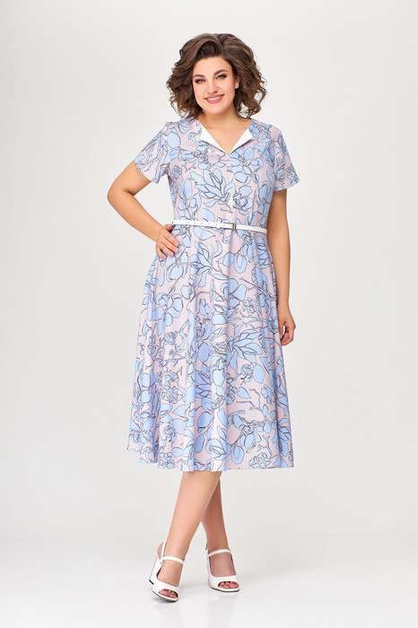 Платье А-силуэта, отрезное по линии талии. Платье - из струящейся принтованной плательной ткани. Перед лифа со средним швом и отложным цельнокроеным воротничком, выполненным из контрастной однотонной хлопковой ткани. По переду и спинке лифа расположены рельефы. В среднем шве спинки предусмотрена молния. Рукав втачной короткий формы «тюльпан».