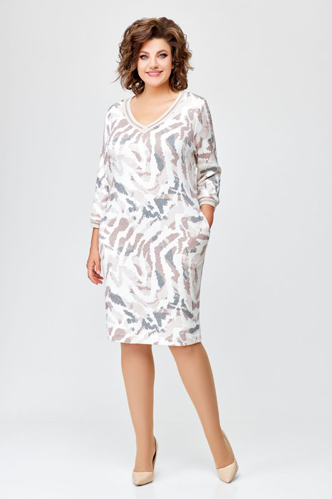 Платье из эластичного трикотажного полотна полуприлегающего силуэта. По переду обработаны нагрудные вытачки. Спинка цельнокроеная. Рукав втачной одношовный длиной 4/5 с манжетой из декоративного трикотажного довяза. В боковых швах обработаны карманы. Горловина V-оборазной формы, обработана декоративным трикотажным довязом.