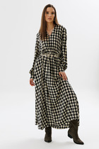 Платье отрезное ниже линии талии.  Верхняя часть выполнена из однотонного полотна, нижняя часть – с дизайном «гусиная лапка».