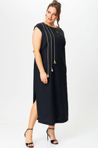 Платье женское из лёгкой ткани, прямого силуэта со съёмным поясом. По переду платья нагрудные выточки, спинка цельная. Вырез горловины овальный, сзади застёжка в виде капельки, на навесную петлю и пуговицу. В пройму вставлены двойные воланы, длина нижнего волана – 15см, верхнего – 12 см. В боковых швах платья разрезы длиной 32 см. Длина платья по спинке 127 см. (+-1 см)