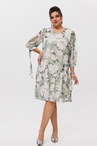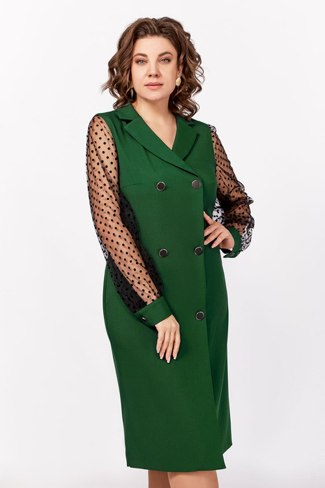 Нарядное платье из поливискозной ткани, полуприлегающего силуэта. Спереди имитация двубортной застёжки с декоративными пуговицами в два ряда. Полочки с фигурными бочками и нагрудными выточками. Спинка с центральным швом и талиевыми выточками. Горловина V-образной формы с отложными лацканами и воротником пиджачного типа. Рукав  втачной длинный из отделочной ткани «сетка», по низу со сборкой и манжетой из основной ткани, застёгивающейся на петлю и  декоративную пуговицу. В боковом шве застёжка на потайную тесьму-молнию.