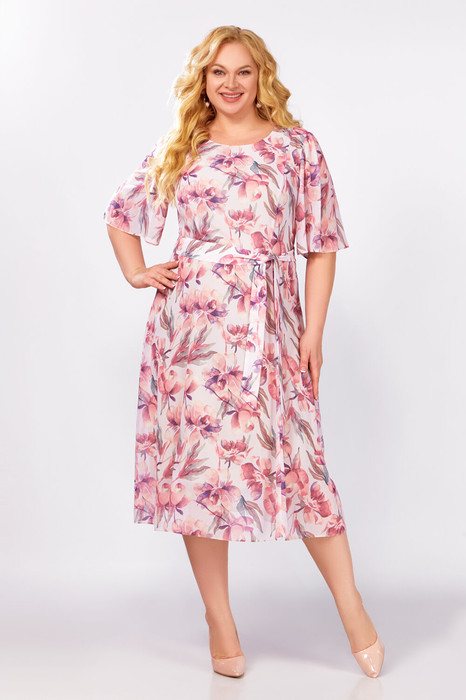 Платье полуприлегающего силуэта из мягкой шифоновой ткани на трикотажной подкладке. Полочка с отрезными рельефами, спинка с центральным швом и рельефами. Горловина округлой формы. Рукав втачной, формы «колокол», по окату с лёгкой сборкой, длиной 34 см.