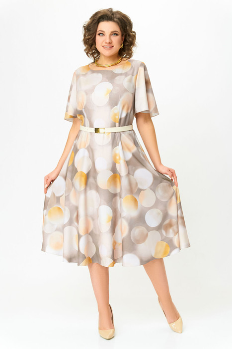 Платье из мягкой вискозной ткани, X-образного силуэта, отрезное по линии талии. Перед лифа с талиевыми вытачками, спинка лифа с центральным швом и талиевыми вытачками. Юбка расклешённая с карманами в боковых швах. Горловина округлой формы. Рукав втачной, короткий, формы «колокол».