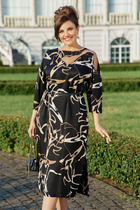 Платье полуприлегающего силуэта из мягкой поливискозной ткани с оригинальным дизайнерским принтом. По полочке выполнены рельефные швы, по спинке рельефные швы, средний шов со шлицей и застёжкой на потайную тесьму-молнию. Горловина круглая, обработана обтачкой. Рукав втачной, короткий.