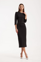 Лиф полочки с нагрудными выточками и округлым вырезом горловины, лиф спинки с центральным швом и V-образным вырезом горловины. Юбка состоит из передней и задней деталей с цельнокроенными планками по бокам, которые скреплены декоративными пуговицами. Рукав втачной, короткий длиной – 28 см.