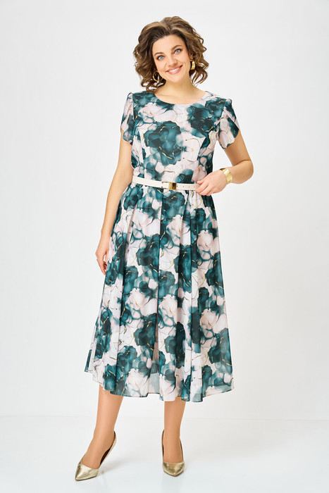 Платье из шифона на трикотажной подкладке, Х-образного силуэта с полуприлегающим лифом. Платье отрезное по линии талии. По переду лифа расположены рельефы, по спинке лифа талиевые выточки. Юбка расклешенная из шести клиньев со встречными складками по линии талии. В среднем шве спинки предусмотрена потайная тесьма- молния. Рукав втачной покроя тюльпан, длина рукава 15 см.