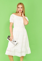 Платье женское, отрезное по линии талии, расширенное к низу. Лиф платья прямого силуэта, отлетной с коротким рукавом. Низ лифа фигурной формы. По спинке чуть длиннее. Платье на трикотажной подкладке. Нижняя часть платья (юбка) присборена по талии на резинку, закреплена с подкладкой. Вырез горловины круглой формы. Платье скреплено с подкладкой по горловине.