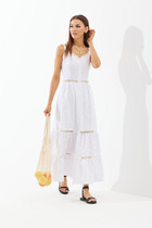 Платье женское, полуприлегающего силуэта с коротким рукавом. Рукав типа "фонарик" со сборкой сверху и снизу. По низу притачная манжета. По переду нагрудные вытачки. Горловина круглой формы. По низу ассиметричная, отлетная планка с разрезом и декоративная нашивка. По спинке средний шов с разрезом снизу и талевые вытачки. Горизонтальный подрез выше линии талии. Верхняя часть спинки и рукав выполнены из ткани сетка с флоковым нанесением. Застежка на потайную "молнию"
