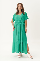 Платье женское, прямого силуэта, с цельнокройным рукавом, длинной 7/8.По переду ассиметричный, фигурный подрез , оформлен воланом и отделочной тесьмой. По спинке средний шов. Вырез горловины круглой формы с тонкой, подрезной бейкой.