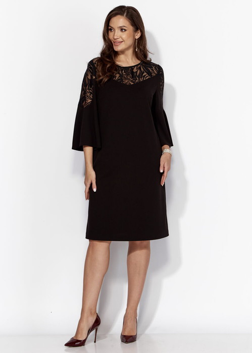Платье женское А-образного силуэта с втачным рукавом длинной 3/4. Рукав расширенный к низу, с фигурной вставкой из отделочной ткани. По переду нагрудные вытачки и кокетка. Вырез горловины круглой формы с ассиметричным пришивным декором. По спинке средний шов, кокетка сложной формы с разрезом. Застежка сзади на навесную петлю и отделочную пуговицу. Вставки рукавов и кокетки выполнены из отделочной ткани (прозрачная органза с рисунком.)