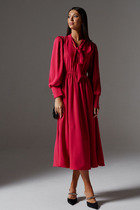 Платье выполнено из яркой, стрейчевой ткани «барби», хорошо держащей форму.
