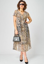 Нарядное платье лаконичного свободного силуэта элегантно подчеркнёт вашу красоту и придаст образу утончённость. Модель выполнена из стрейчевой струящейся ткани с матовым блеском. Перед с нагрудными вытачками, декоративными клиньями(переходящими на спинку), по низу с воздушным воланом со сборкой. Спинка со средним швом и воланом. Округлый вырез горловины дополнен декоративным элементом из основной ткани, плавно спадающим вдоль переда. Рукав втачной с вертикальным швом, длиной ниже локтя, по низу с завязывающейся патой. Отделкой комплекта служит фурнитура (может отличаться от представленной на фото).