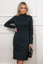 Платье прямого силуэта со спущенной линией плеча. Центральная застежка на тесьму-молнию,которая закрыта декоративной планкой. Рукав длинный с манжетой по низу.По переду платья расположены накладные карманы с клапанами. В боковых швах карманы,по низу платья разрезы. Спинка со средним швом и кокеткой, в которой вставлен волан.