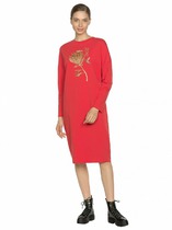 Платье женское, полуприлегающего силуэта, слегка расширенное к низу, длиной миди. По переду декольте задекорировано руликами по форме горловины, с декоративной брошкой. На спинке платья расположены талиевые выточки и средний шов, с застежкой на "тесьму- молнию". Рукава одношовные до линии локтя. Горловина округлой формы.