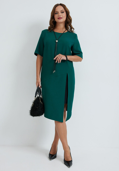 Эффектное платье прямого силуэта, выполненнное из поливискозы двух цветов. Перед платья с круглой горловиной и нагрудными вытачками. Перед платья в области бедра с косым подрезом. Нижняя часть переда состоит из верхней и нижней юбки. Верхняя юбка с косым низом и разрезом. Нижняя юбка из ткани контрастного цвета, имитирующая вторую юбку. Спинка с потайной молнией в среднем шве. Рукав втачной, длиной до линии локтя. В комплект к платью входит декоративная подвеска.
