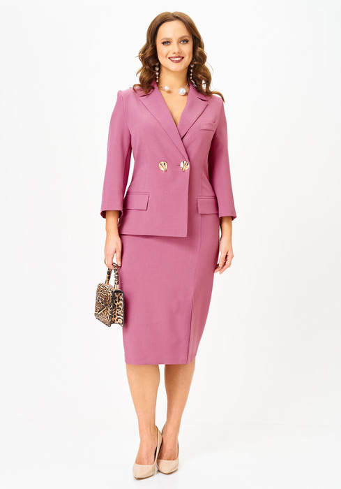 Платье прилегающего силуэта, длиной миди, выполненное из плательной поливискозы. Платье жакетного типа с ассиметричным передом. Одна из сторон переда имитирует жакет и юбку, другая-платье. Перед с талиевыми вытачками с подрезом. В области груди настрочена декоративная листочка, в области бедер - карманы-обманки с листочками и клапаном. По переду обработан разрез. В области талии расположена застёжка на 2 петли и крупные декоративные пуговицы. Спинка  со средним швом, в который вставлена потайная молния. Рукав 2-х шовный втачной, длиной 3/4.