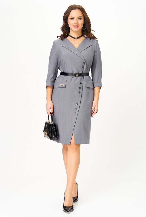 Элегантное платье полуприлегающего силуэта с асимметричной застежкой на петли и пуговицы. Перед платья с нагрудными вытачками и клапанами в области бёдер. Спинка с талиевыми вытачками и средним швом, внизу которого обработана шлица. Застежка асимметричная, двубортная, по низу платья расходится на разрез. В области плеч — погоны, закрепляющиеся на пуговицу. Рукава двухшовные втачные, длиной 3/4, с притачной манжетой. Платье с плечевыми накладками и со съёмным ремнем в цвет фурнитуры. Фурнитура и комплектующие (ремень) могут незначительно отличаться от представленных на фото.