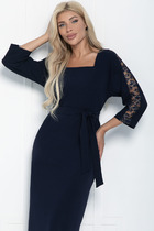 Платье-рубашка полуприлегающего силуэта, длиной миди, выполненое из поливискозы. Перед с нагрудными вытачками и центральной застёжкой на петли и пуговицы на притачной планке. В области груди расположена декоративная нашивка. Горловина обработана воротником рубашечного типа. Спинка цельнокроеная с талиевыми вытачками. Рукав втачной, длиной 3/4, с притачной манжетой, застегивающейся на петлю и пуговицу. В нижней части боковых швов обработаны шлицы, которые застегиваются на петли и пуговицы. В боковых швах в области бедер обработаны карманы. В комплекте ремень.