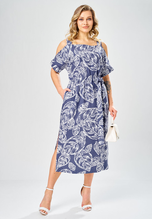 Сарафан женский прямого силуэта на широких бретелях. Выполнен из хлопчатобумажной плательной ткани с растительным принтом. Сарафан с открытой линией плеч и цельнокроенным рукавом до линии локтя. Низ рукава обработан притачной манжетой. Перед сарафана с нагрудными вытачками. Спинка цельнокроенная. По линии талии обработана планка с эластичной резинкой. На планке расположен декоративный пояс, завязывающийся на бант. В области бедер в боковых швах обработаны карманы. В нижней части боковых швов сарафана обработаны разрезы.