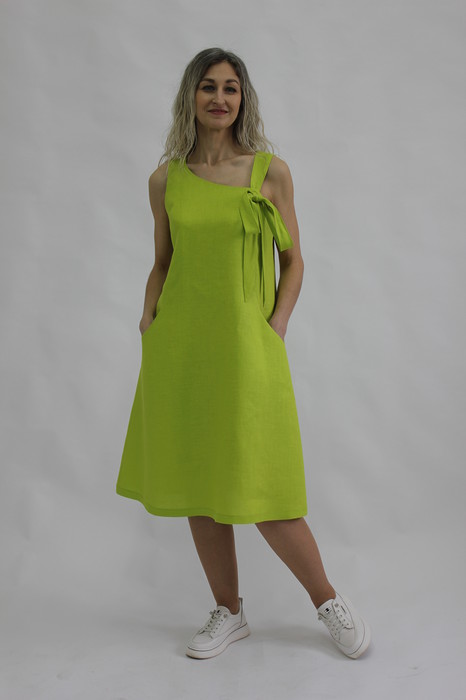 Сарафан полуприлегающий, расширенный к низу. По переду в рельефных подрезах карманы. Вырез горловины ассиметричный. С левой стороны бретель завязывающаяся на бант. Спинка со средним швом (без молнии). Длина изделия 105 см.