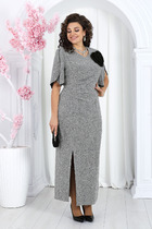 Платье из плательной штапельной ткани с набивным рисунком, свободного покроя, отрезное по линии талии, с короткими втачными рукавами и горловиной овальной формы, обработанной обтачкой. Полочка – с вытачками в области груди. Юбка – из двух ярусов, каждый из которых присборен по шву соединения с верхней деталью.