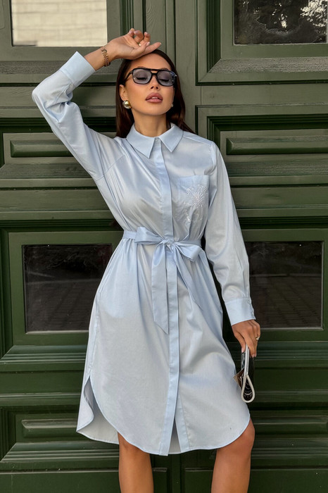 Элегантное голубое платье-рубашка с поясом и вышивкой на нагрудном кармане — идеальный выбор для повседневного и офисного образа. Модель выполнена из качественной костюмной ткани, приятной к телу, сдержанно сияющей на солнце. Благодаря прямому силуэту и акценту на талии за счёт пояса, платье выгодно подчеркивает фигуру и подходит для любого типа телосложения.