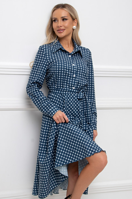 Красивое платье приталенного силуэта из легкой ткани - ниагара. Горловина оформлена отложным воротником на стойке. По переду выполнена планка с застежкой на петли и пуговицы. Длинный втачной рукав, оканчивается притачной манжетой. В боковых швах функциональные карманы. Модель отрезная по линии талии, присобрана на эластичную резинку. Тканевый пояс дополнительно акцентирует талию. Модель прекрасно дополнит ваш гардероб.