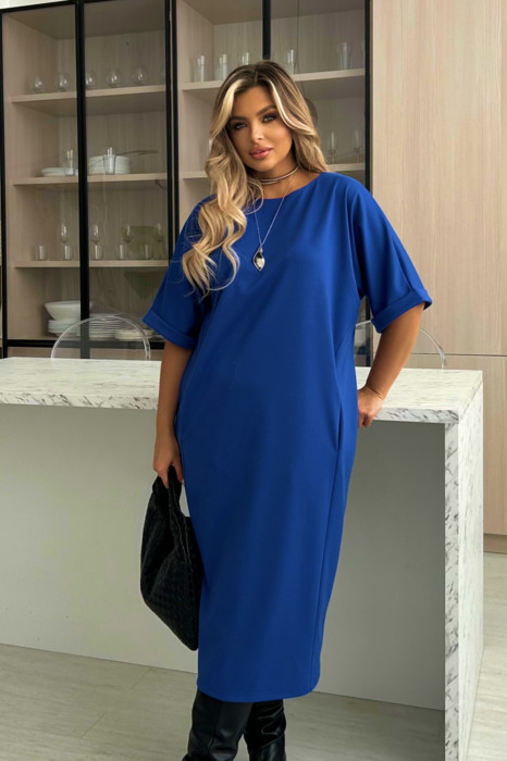 Комфортное платье свободного кроя из трикотажного полотна. Округлая горловина на внутренней обтачке. Цельнокроеный рукав оканчивается притачной манжетой с отворотом. По переду расположены функциональные карманы. Низ ровный, сзади шлица.