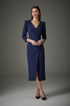 Элегантное платье прямого силуэта изготовлено из трикотажного полотна. V-образная горловина на внутренней обтачке. Втачной рукав фонарик со спущенным плечом. Низ ровный, без разрезов. Модель дополняет пояс с отделкой.