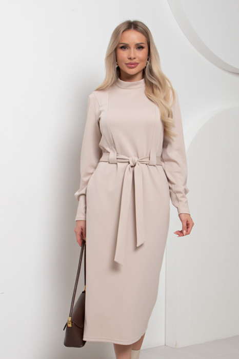 Комфортное платье полуприлегающего силуэта из трикотажного полотна. Горловина оформлена воротником- стойка. Длинный втачной рукав по низу оформлен встречной складкой. В боковых швах функциональные карманы. Линию талии дополняют цельнокроеные шлевки. По спинке застежка на потайную молнию. Низ ровный, сзади шлица. Пояс из основной ткани в комплекте.