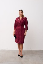 Женственное платье полуприлегающего силуэта изготовлено из трикотажного полотна. V-горловина на внутренней обтачке. Длинный втачной рукав по низу присобрен на резинку. По среднему шву спинки застежка на потайную молнию. Низ ровный, сзади разрез.