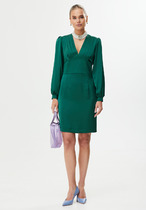 Платье свободной формы из струящейся ткани. Длина миди. Воротник рубашечный. Застежка по переду на кнопки. Длина застежки до талии. По спинке кокетка. В боковых швах карманы. Рукава длинные с манжетой по низу. По передней части рукав с застежкой на кнопки. В комплекте съемный ремень с пряжкой.