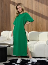 Платье полуприлегающего силуэта чуть расширенное к низу из плательно-блузочной ткани. По линии плеча выполнены разрезы. Горловина со стойкой, переходящей в завязки. По низу боковых швов разрезы. Застежка-молния в среднем шве спинки. Платье на подкладке. Длина 124 см.