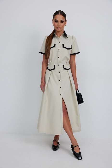 Платье из тонкой джинсовой ткани полуприлегающего силуэта длины «миди» расширенное к низу. По талии подрез, нижняя часть платья с карманами в боковых швах и встречными складками по талии. По переду планка с застежкой на петли и пуговицы. Верх переда и линия подреза с клапанами. Воротник на стойке. Рукав втачной короткий. Край клапанов, низ рукавов и воротник из отделочной ткани.