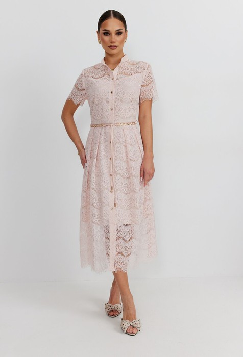 Платье из кружевной ткани полуприлегающего силуэта длины «миди»  расширенное к низу. По талии подрез, нижняя часть платья со встречными складками по талии. По переду планка с застежкой на петли и пуговицы. По горловине стойка. Рукав втачной короткий. Платье на подкладке. Поясок в комплекте.