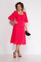 Платье женское полуприлегающего силуэта, зауженное к низу. Перед с декоративными кантами из отделочной ткани из проймы до низа и с вытачками из рельефов. Спинка со средним швом, в котором обработана потайная тесьма-молния и шлица. Также по спинке обработаны талиевые вытачки. Рукав втачной длиной 3/4 фантазийной формы на запах, расширенный к низу, двойной. Обтачен отделочной тканью. Горловина овальной формы.