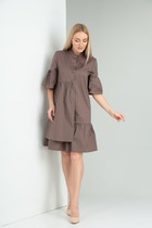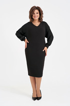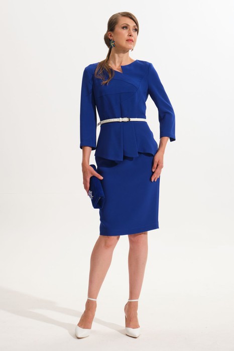 Платье приталенного силуэта с подрезом по линии талии.Спинка со средним швом и рельефами. В среднем шве спинки застежка на тесьму-молнию и шлица.Перед с фигурными рельефами.Горловина сложной художественной формы.Рукав втачной двухшовный 3/4, с разрезом в локтевом шве.В талиевый шов вставлена отлетная баска с декоративными складками.Лиф платья выполнен на подкладке.На переде имеется декоративная брошь.Также имеется декоративный навесной пояс.