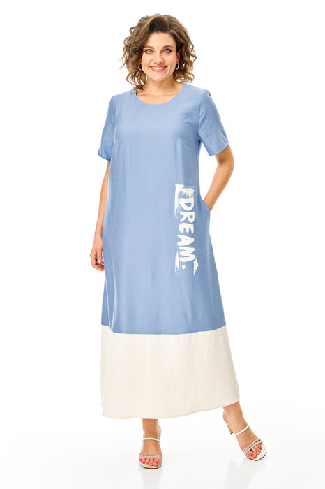 Платье женское А-образного силуэта с естественной линией плеча. Горловина округлой формы. В среднем шве спинки застежка на тесьму-молнию.Перед и спинка с отрезной нижней частью контрастного цвета. В боковых швах обработаны карманы. Рукав короткий одношовный. По переду нанесен авторский принт в цвет нижней части платья.