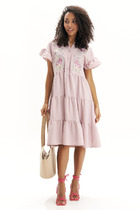 Платье женское А-образного силуэта со спущенной линией плеча. Рукав типа "летучая мышь". Горловина округлой формы. В среднем шве спинки застежка на тесьму-молнию. По переду выполнен ряд ассиметричных подрезов с кантами контрастного цвета и легкая сборка. В боковых швах обработаны карманы. Горловина, низ рукава и платья окантованы тканью контрастного цвета.