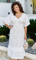 Каждая деталь этого платья пронизана нежностью и шармом. Платье позволяет каждой женщине, носившей его, ощущать себя неотразимой. Оно является идеальным выбором для летних встреч, прогулок по берегу моря или романтических свиданий в парке. Платье словно создано для того, чтобы хранило воспоминания о теплом летнем времени. Подкладка бежевого цвета привносит в гармонию образа тепло и мягкость, создавая идеальный контраст с белым верхом. Этот нюанс становится нежным фоном, позволяя платью «заиграть» новыми оттенками в зависимости от угла света и движений. Бежевый акцент не только добавляет глубину, но также делает образ более уютным и стремится обвить фигуру женщины мягкостью нежного прикосновения.