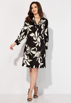 Платье прилегающего силуэта, с округлой формой горловины с ассиметричным подрезом по талии и небольшим напуском. Рукав в платье ассиметричный (левый-цельнокроеный, правый со спущенный проймой через подрез по лифу платья). От подреза притачная баска, юбка платья прямая с разрезом в боковом шве. В боковом шве платья застёжка на тесьму-молнию.Длина платья 135 см. Длина рукава левого 39 см (р.50-54), 40 см (р.56-60). Длина рукава правого 52 см (р.50-54), 53 см (р.56-60)