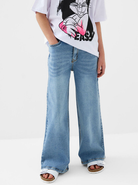 Прямые широкие джинсы для девочки подростка. Застёжка на молнию и болт. Внутри пояса предусмотрена эластичная лента с пуговицей для регулировки объема. Изделие выполнено из варёного денима с модным эффектом потертостей. Джинсы свободного кроя и стандартной посадки на талии. Спереди – два кармана, сзади – два накладных кармана. На поясе сзади — яркая нашивка с логотипом.