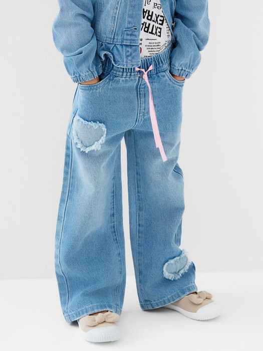 Детские джинсы для девочки. Пояс на мягкой резинке с декоративным бантом из розовой ленты. Модель прямого кроя, свободная с длиной до щиколотки. Спереди есть два удобных кармана, сзади — два накладных кармана.