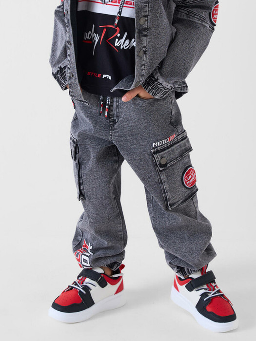 Детские джинсы-джоггеры для мальчика. Модель выполнена из плотного черного денима с эффектом варки. Штанины прямые, со сборкой на резинке по низу, пояс тоже на резинке со шнуром. Спереди два кармана, по бокам — объемные карманы-карго на кнопках, сзади — два накладных кармана. Такой дизайн отлично подойдет для активных детей, вдохновленных гоночной тематикой.